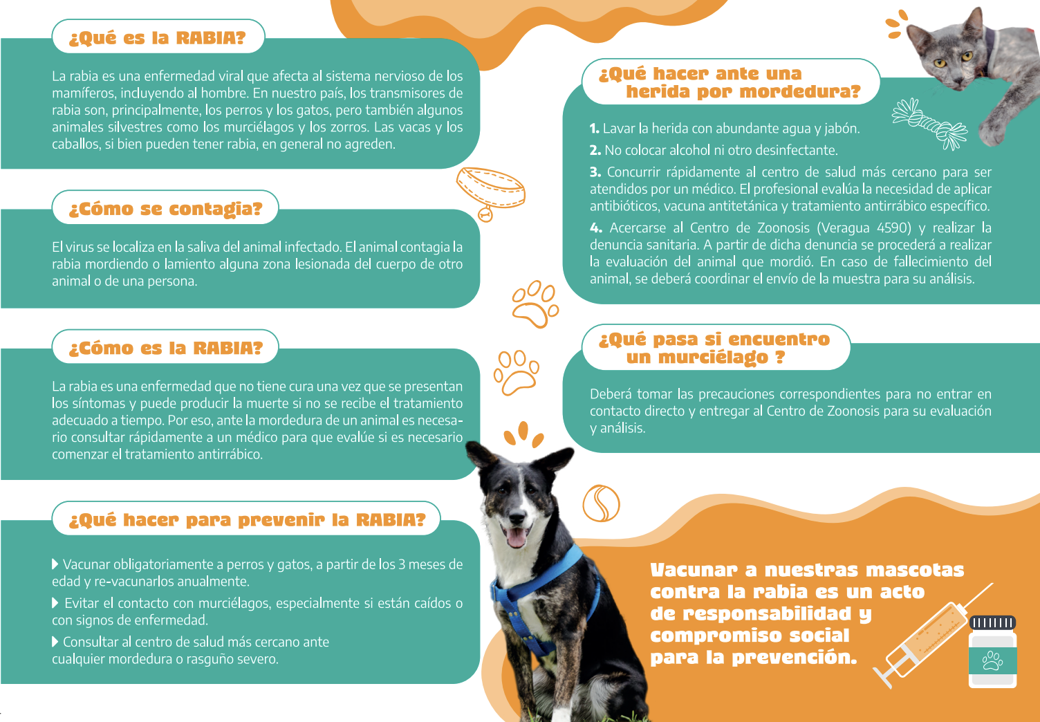 La vacunación antirrábica es obligatoria y debe repetirse anualmente. Se aplica en forma gratuita sin turno en Clínica Veterinaria Municipal y Operativos de Zoonosis.